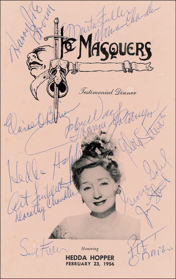 Program for a 1956 Masquers testimonial dinner honoring Hedda Hopper, 6.25 x 9.25, signed on the cover in ballpoint by John Wayne and several others, including Hopper herself, Gloria Stewart, Art Linkletter, Sam Fuller, George Gobel, Jimmy Stewart, and Pat O’Brien. A few small, faint water spots, and two signatures lightly touching Wayne’s, otherwise fine condition. R&R COA.
