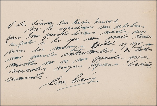 ALS in Spanish, one page, 9 x 6, embossed personal letterhead, no date. In full (translated): “I appreciate your words, but I can do nothing about what you asked me. Apold handles those things and I cannot interfere. All the same do not ‘disappear’ so we can remember the old days....” In fine condition overall, with vertical fold through “P,” a few brushes to text, marginal tear, and a touch of mild toning. R&R COA.