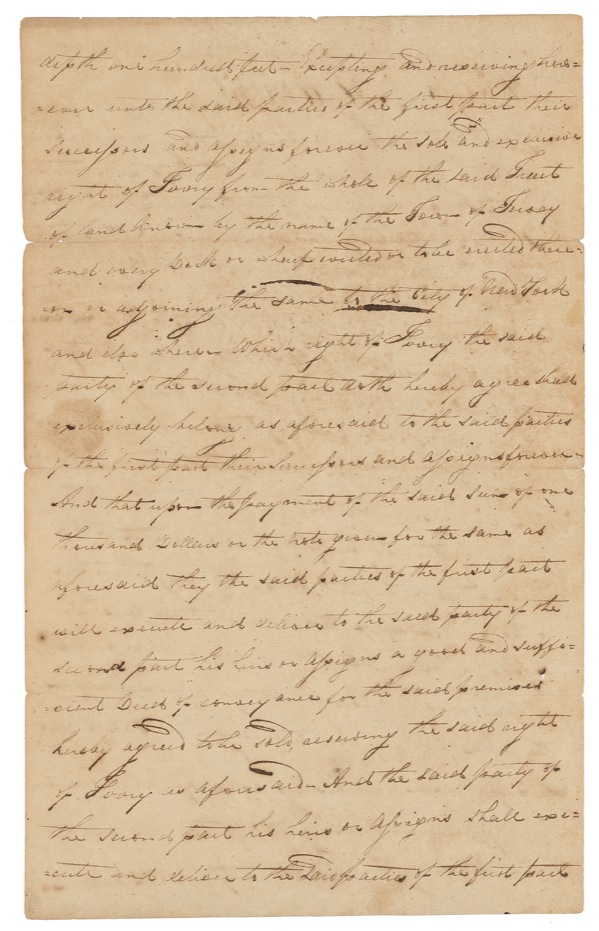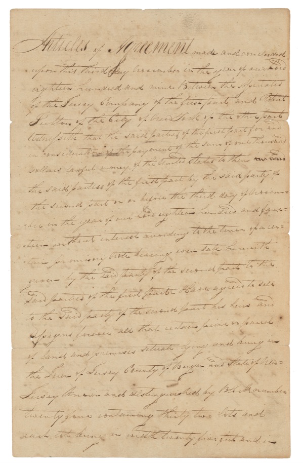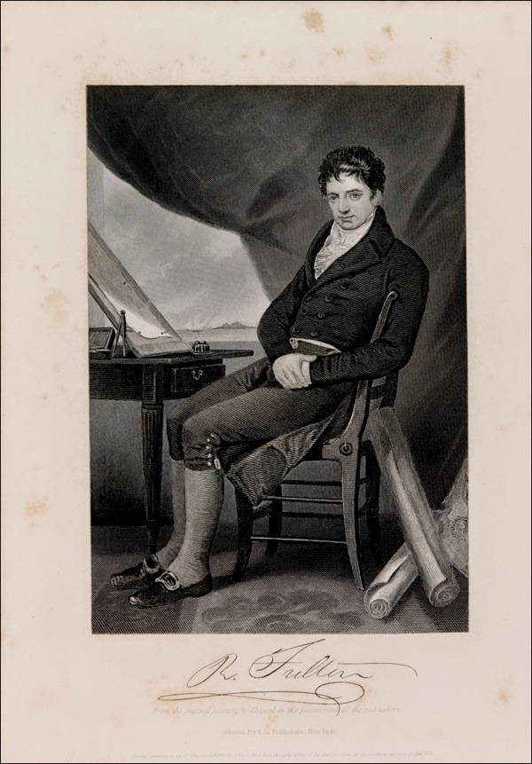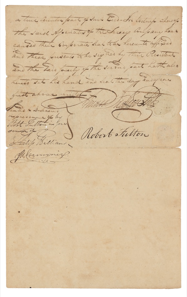 American inventor, engineer, and entrepreneur (1765–1815) best known for designing the first commercially successful steamboat. His other endeavors included a commission from Napoleon that resulted in the first practical submarine, the Nautilus. Manuscript DS, three pages on two sheets, 7.5 x 12.5, November 3, 1809. An agreement between Fulton and the Jersey Company wherein Fulton purchases a parcel of land in the Town of Jersey, Bergen County, New Jersey, for the sum of $1,000, payable (without interest) by November 3, 1814. Accompanied by an antique portrait engraving. In very good condition, with partial separations to folds (a few tape repairs) scattered soiling and light staining, subtle show-through of ink, and light handling wear. The signature is bold, clean, and unaffected by any faults, and itself easily rates as fine. Auction LOA John Reznikoff/PSA/DNA and R&R COA.