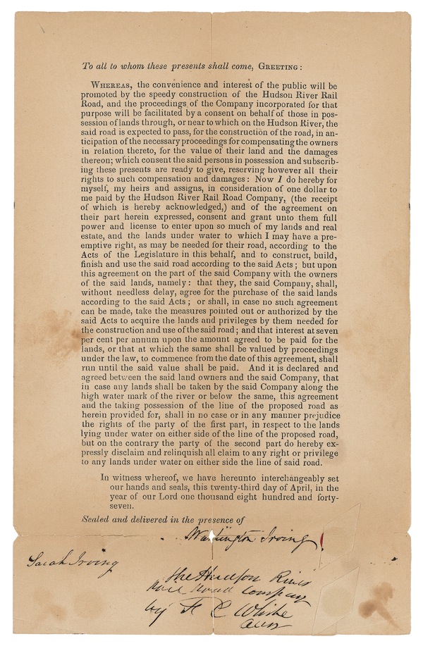 American author (1783–1859) best known for his stories “The Legend of Sleepy Hollow” and “Rip Van Winkle.” Printed DS, one page, 6 x 9.5, April 23, 1847. An agreement wherein Irving grants to the Hudson River Rail Road the right to build on property owned by him in exchange for one dollar. The document is also signed by Sarah Irving (evidently his sister or niece, the latter of whom served as a hostess at his home). In good condition, with light toning and staining and intersecting folds (horizontal fold with near-complete separation through signature; hole at intersection affecting a few letters of first name). R&R COA.