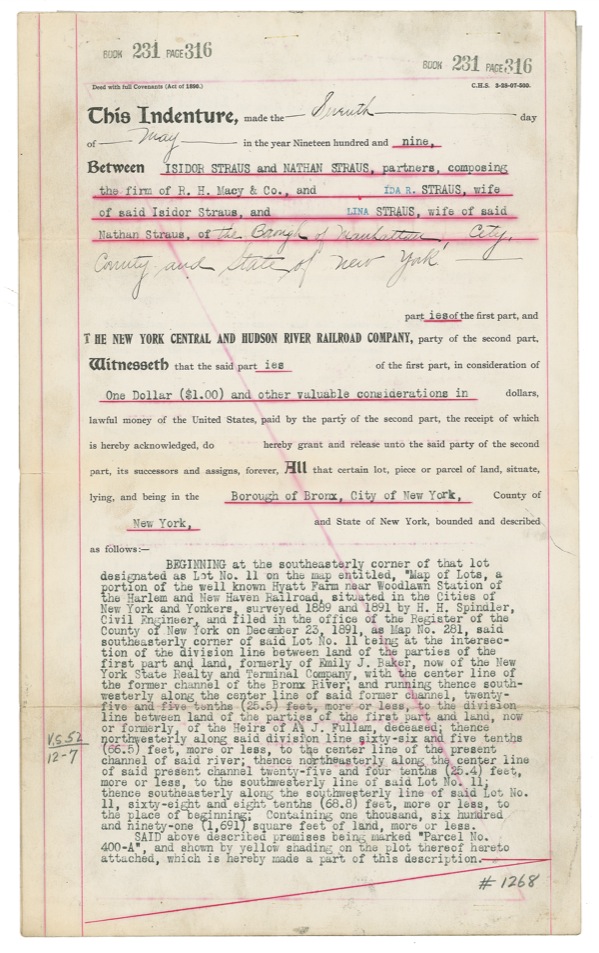 Businessman and politician Isidor Straus (1845–1912) was best known as the co-owner of Macy’s department store; during 1894–95, he also served a brief term in Congress. In 1871, Straus married the former Rosalie Ida Blun (1849–1912), and the couple had seven children. On the fateful night of April 14, 1912, the Strauses were en route back to the United States from Germany aboard the RMS Titanic when the ship struck an iceberg and sank less than three hours later. As the ship was being evacuated, Ida gave up a seat in a lifeboat to her maid and gave the young woman her fur coat, observing that “I won’t need this anymore.” Ida later boarded the second-to-last lifeboat, but climbed out at the last minute to be with her husband; the two were last seen in an embrace. Both of the Strauses were among the more than 1,500 who perished in the tragedy. Isidor’s body was later recovered, while Ida’s was never found. DS, signed “Isidor Straus” and “Ida R. Straus,” three pages on two sheets, 8.5 x 14, October 9, 1909. A quitclaim deed wherein Isidor Straus and Nathan Straus (his business partner and brother; 1848–1931), and their wives (Ida R. Straus and Lina Straus, respectively) sell to the New York Central and Hudson River Railroad Company a parcel of land in the Bronx “in consideration of one dollar ... and other valuable considerations.” The document, which includes a hand-drawn color map of the plot in question, is also signed by Nathan and Lina Straus. In very good condition, with slight edge separations at folds (one fold just touching top of Ida’s “S”), and scattered soiling and document wear. R&R COA.