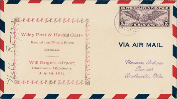 Popular American entertainer (1879–1935) who cultivated an image as a wisecracking cowboy and earned worldwide renown for his mordant wit and skill at rope tricks. After a successful vaudeville career, including a stint as the one of the star attractions of the Ziegfeld Follies, Rogers made an easy transition to films and became one of the top box-office draws of the late 1920s and early 1930s. His career came to an untimely end when he died in a plane crash in Alaska along with pilot Wiley Post. Air mail commemorative cover, with a cachet honoring the dedication of the Will Rogers airport on July 14, 1931, signed vertically in fountain pen along the left side. In fine condition, with a mild overall shade of toning, and a few creases to center, not affecting signature. R&R COA.