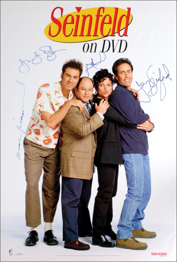 Color 27 x 40 poster for the release of Seinfeld on DVD, signed in blue felt tip by Jerry Seinfeld, Michael Richards, Julia Louis-Dreyfuss, and Jason Alexander. Rolled and in fine condition, with some scattered light edge dings and creases. R&R COA.