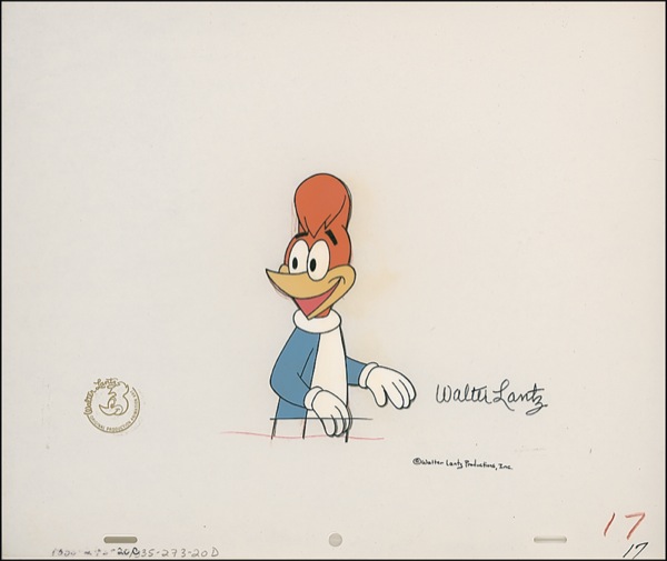 Three original production cels with corresponding pencil drawings, two (from “Flim Flam Fountain”) featuring Woody Woodpecker, the other (from an unknown production) featuring a multi-cel setup with Woody and Buzz Buzzard, each cel or setup signed in black felt tip by Walter Lantz. Accompanied by certificates of authenticity from MCA/Universal. In fine condition. R&R COA. R&R COA.