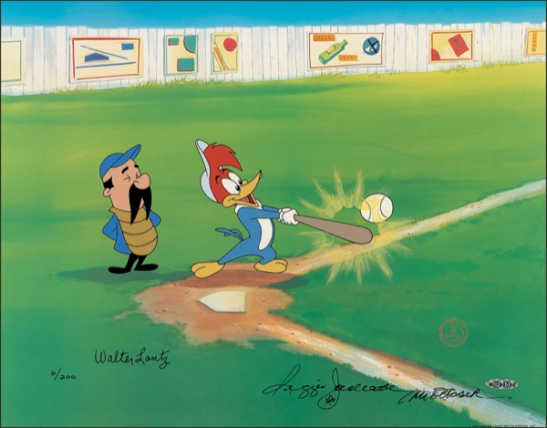 Limited edition cel titled “Woody Gets a Hit,” 6/200, 16.5 x 13.5, signed in black felt tip “Walter Lantz” and “Reggie Jackson, 44, Mr. October.” Accompanied by a certificates of authenticity from MCA/Universal and Upper Deck. In fine condition. Auction LOA Steve Grad/PSA/DNA and R&R COA.