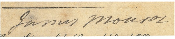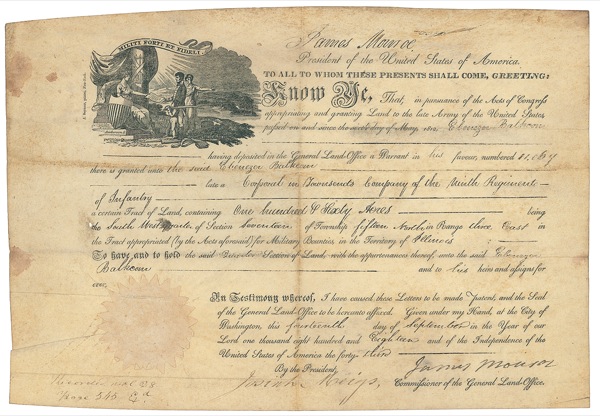 DS as president, one page, 13.25 x 9.25, September 14, 1818. President Monroe grants Ebenezer Balkcom, “late a Corporal in Townsend’s Company of the Ninth Regiment of Infantry,” 160 acres of land in the Illinois Territory. Signed at the bottom in black ink by Monroe, and countersigned by Commissioner of the General Land Office Josiah Meigs. In very good condition, with intersecting storage folds, even overall toning, a few darker spots to left edge, and some light wrinkling. The white paper seal is worn, but intact, and Monroe’s signature remains dark and clear. Auction LOA John Reznikoff/PSA/DNA and R&R COA.