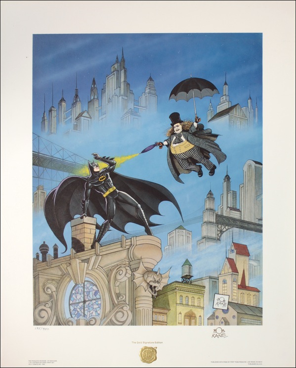 Limited edition color print titled “The Penguin’s Revenge,” 135/950, 20.5 x 25.5, signed in gold ink “Bob Kane.” A minor ding or two, otherwise very fine condition. Rolled. R&R COA.