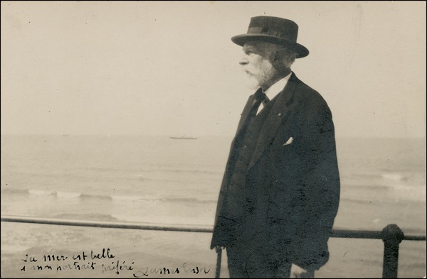 Belgian painter and printmaker, an important influence on expressionism and surrealism. Vintage 5.5 x 3.5 postcard photo of Ensor at the ocean, signed in fountain pen, “La mer est belle a mon portrait préféré [The sea is beautiful, my preferred portrait], James Ensor.” Light silvering to darker areas and a couple trivial corner tip dings, otherwise fine condition. R&R COA.