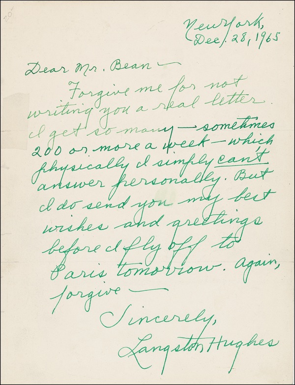 Uncommon ALS, one page, 8.5 x 11, December 28, 1965. Hughes writes to a fan. In full: “Forgive me for not writing you a real letter. I get so many—sometimes 200 or more a week—which physically I simply can’t answer personally. But I do send you my best wishes and greetings before I fly off to Paris tomorrow. Again, forgive….” Mild handling wear, faint water spot to one word, and tiny edge tears (tape repair to one lightly showing through), otherwise fine condition. R&R COA.