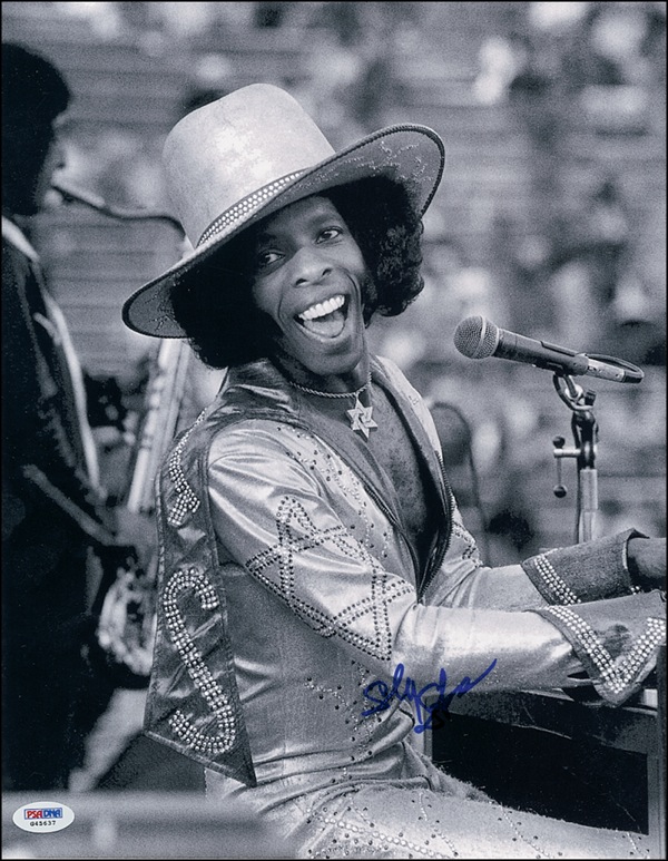 Glossy 11 x 14 photo of Stone performing, signed in blue felt tip. Accompanied by a certificate of authenticity from PSA/DNA. In very fine condition, with a PSA/DNA authentication label affixed to lower left. Difficult to acquire as Stone is a virtual recluse. R&R COA.