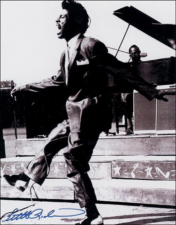 Glossy 11 x 14 photo of Little Richard performing outdoors, signed along the bottom in blue felt tip. In very fine condition. COA Roger Epperson/REAL and R&R COA.