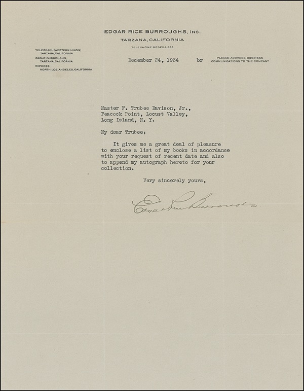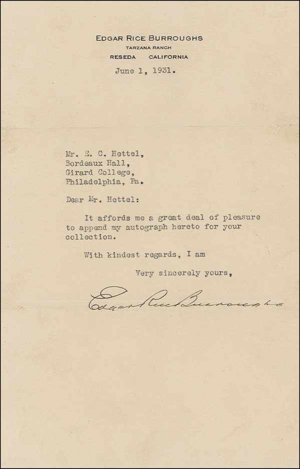 Creator of Tarzan. Two one page TLS, one measuring 5.5 x 8.5 on personal letterhead, dated June 1, 1931, the other measuring 8.5 x 11, on business letterhead, dated December 24, 1934, both complying with autograph requests from admirers. In fine condition, with intersecting mailing folds to both, with a horizontal fold lightly affecting both signatures. R&R COA.