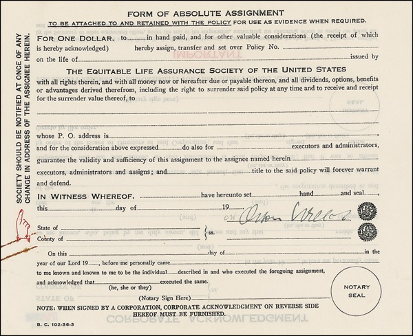 DS, one page both sides, 8.5 x 7, no date. A blank life insurance policy form from the Equitable Life Assurance Society of America, signed at the bottom in black ink. Accompanied by a full PSA/DNA LOA. Paperclip rust stain to left margin, otherwise fine, clean condition. R&R COA.