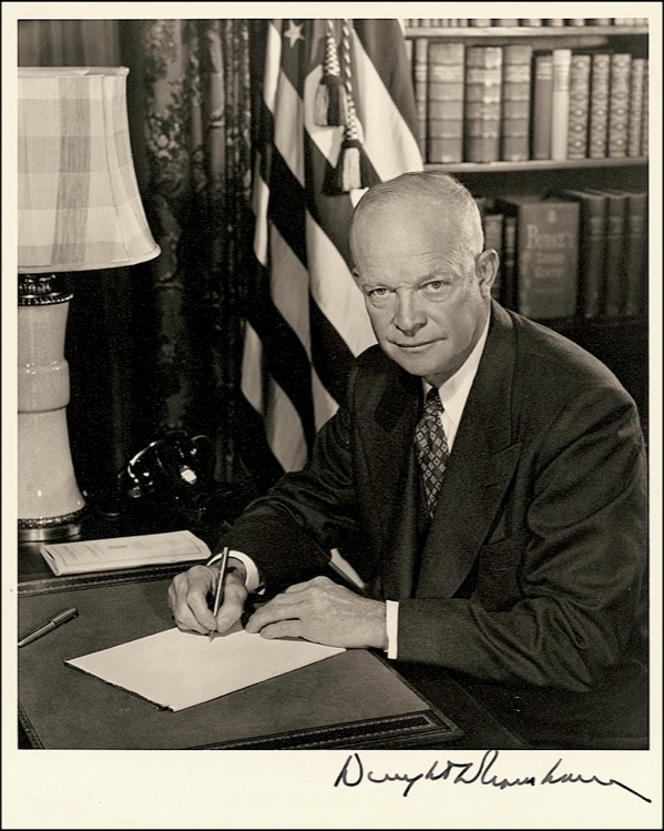 Vintage matte-finish 8 x 10 photo of Ike at his desk, affixed to a slightly larger card, signed in fountain pen as president. Accompanied by a 1953 secretarial letter of transmittal on White House letterhead. A few subtle ripples and mounting as noted, otherwise fine, clean condition. Auction LOA John Reznikoff/PSA/DNA and R&R COA.