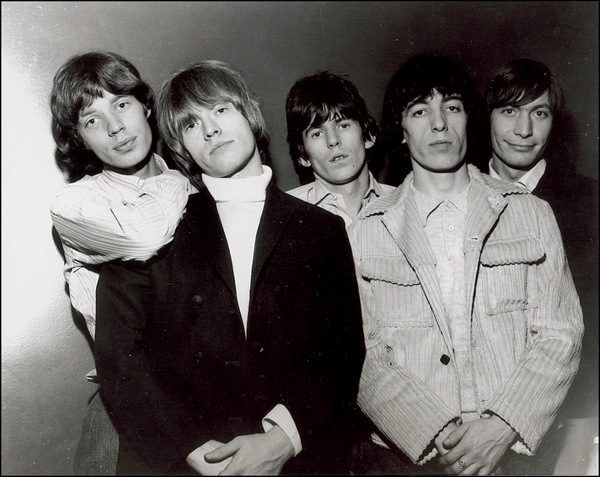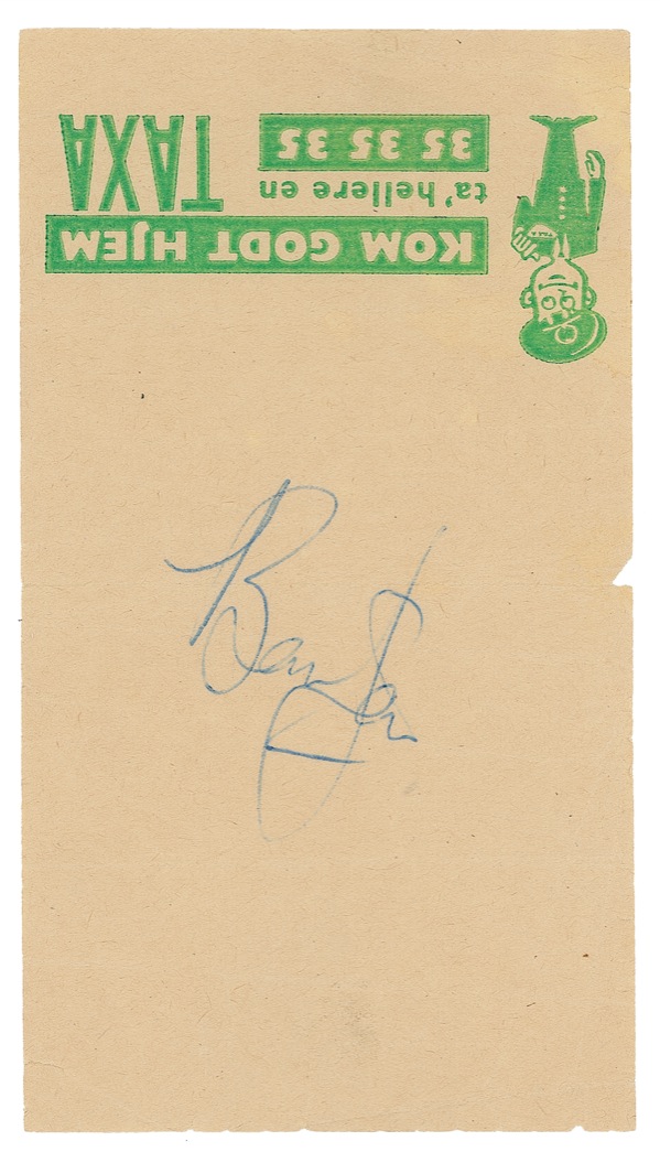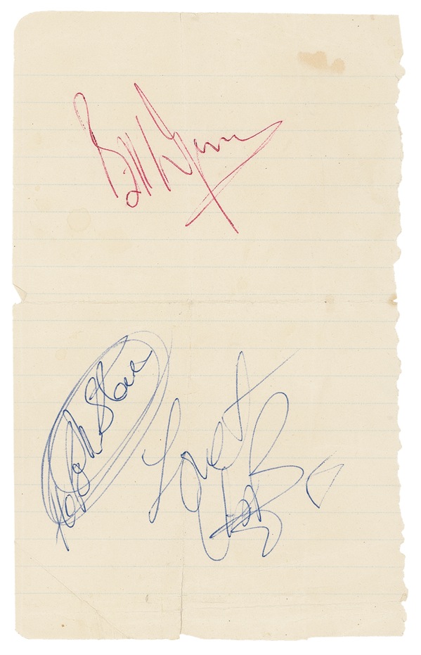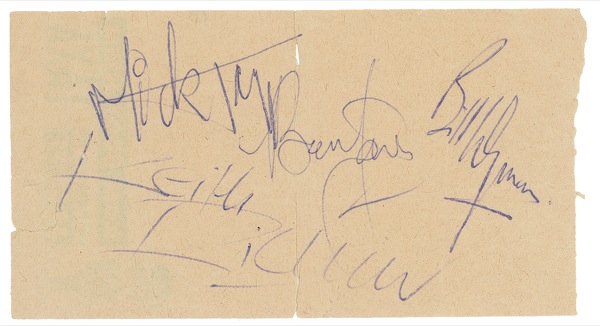 Three items: Danish taxi receipt, 5.25 x 3.75, signed on the reverse in ballpoint by Mick Jagger, Brian Jones, Keith Richards, and Bill Wyman; a similar receipt, signed in ballpoint on the blank portion of the front “Brian Jones”; and a lightly lined 4 x 6.5 notebook page, signed in red ballpont by Bill Wyman and in blue ballpoint by Charlie Watts. Accompanied by a ticket stub from a concert at the Falkoner Centret in Denmark on June 26, 1965. In good to very good condition, with creases and wrinkles to all three items (touching signatures); tears to first item touching “B” of “Brian,” crossbar of Jagger’s “J,” and “ch” of “Richards”; another tear near “K” of “Keith”; and tears to notebook page near but not touching Watts’s last name. COA Roger Epperson/REAL and R&R COA.