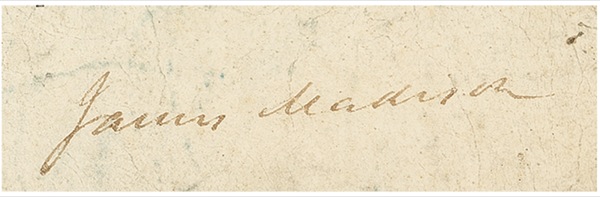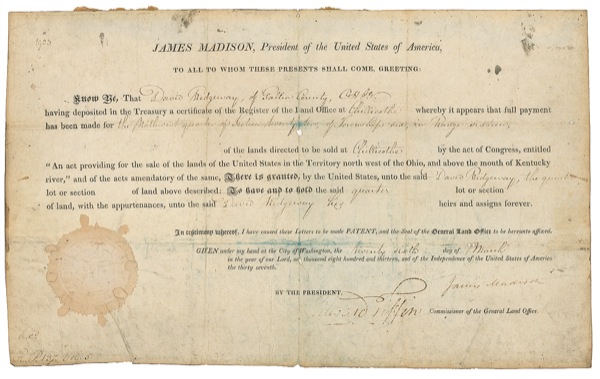 DS as president, one page, 14.75 x 9, March 26, 1813. President Madison grants a tract of land to David Ridgeway “in the Territory north west of the Ohio, and above the mouth of the Kentucky River.” Signed at the conclusion in ink by Madison, and countersigned by the Commissioner of the General Land Office. In good condition, with moderate intersecting storage folds, several creases, several small areas of paper loss along folds, mild staining to lower portion of document, Madison’s signature a shade or two light, but completely legible, and mounting remnants to reverse. The white paper seal is intact, and Madison’s signature is mostly unaffected by the flaws. Auction LOA John Reznikoff/PSA/DNA and R&R COA.