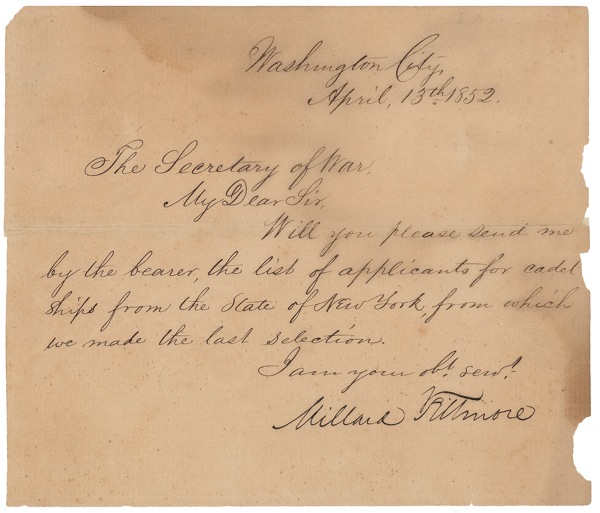 LS as president, one page, 7 x 6, April 13, 1852. Letter to the Secretary of War. In full, “Will you please send me by the bearer, the list of applicants for cadetships from the State of New York, from which we made the last selections.” Repaired horizontal fold and diagonal tear, several small areas of paper loss to right edge, and moderate damp staining to top portion, otherwise very good condition. Auction LOA John Reznikoff/PSA/DNA and R&R COA.