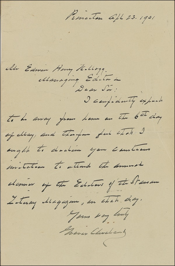 ALS, one page, 4.5 x 7, April 23, 1901. Letter politely declining an invitation. In full, “I confidently expect to be away from home on the 6th day of May, and therefore feel that I ought to decline your courteous invitation to attend the annual dinner of the Editors of the Nassau Literary Magazine, on that day.” In fine condition, with tape repair to reverse of horizontal mailing fold, some scattered light creases, one through portion of text, and a mild shade of toning. Auction LOA John Reznikoff/PSA/DNA and R&R COA.