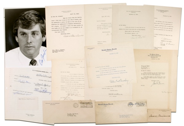 Thirteen items: vice-presidential card signed by Charles W. Fairbanks; portrait engraving signed by Henry A. Wallace; off-white card signed by Wallace; 1963 DS signed by Spiro Agnew; glossy 8 x 10 photo signed by Dan Quayle; and TLS (several as vice-president) by Charles W. Fairbanks (1915), James S. Sherman (1909), Thomas R. Marshall (1916) Charles G. Dawes (1937), Charles Curtis (1933), John N. Garner (1932), Henry A. Wallace (1944), and Alben Barkley (1955). In fine condition overall, with scattered mailing creases, toning, soiling, and handling wear. R&R COA.