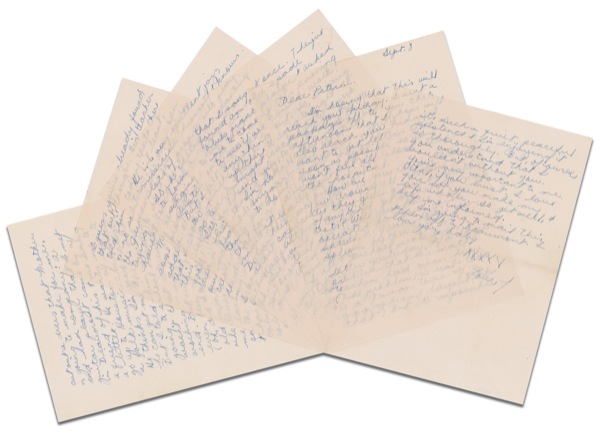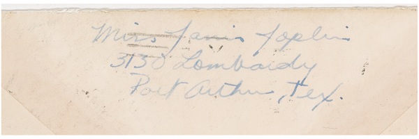 ALS signed “XXXXX, Love, J,” six pages, 5.75 x 8, September 8 [1965]. Joplin writes to her then-fiancé Peter DeBlanc, menioning her small-scale performances, her love for Peter, and her rather humdrum life in Texas. Joplin expresses excitement over her $125 per-week gigs, making clear that at this stage in her life, she had no notion of where her musical career would eventually take her. In part: “Had a pretty busy day…. A guitar player that I met in Beaumont came by w/ a friend of his & we sang a little. He wants me to go up to Houston w/ him to a folk music club & sing. He thinks I’m good & says he can get me $125 a week. But I told him I was going to school & really wasn’t that interested in working—maybe a weekend. But we’ll see. I haven’t even been up there yet. (Oh, did I tell you that an old friend of mine [8 yrs] who lives in Austin called me last week? He works on the newspaper up there & has just been given a column to do—an entertainment column…. He is an excellent jazz musician himself & knows lots of people who play. So he called me wanting to form a group w/ me singing, to work around Austin on the weekends. But I felt it was really too much of a hassle to go back & forth to Austin. It’s an 8 hr. drive, so I told him that I couldn’t. (Wasn’t feasible). But if the Houston thing pans out, I might do that for a weekend ($20 a night) if you think it’s okay. Do you? You needn’t worry about my falling for any dapper young folk singers. I’ve been that route & I know where they are at & I don’t want in! Also, a girlfriend of mine from Beaumont called this evening. She is connected w/ that coffee-house in Beaumont that I sang at once. They’ve found an old spade blues piano player & asked me to come up this evening to see if we could work anything out. So, I’m going up there to sing tonight. It might evolve into a weekend gig too. But, it’s funny, I’m not all that ambitious anymore. But I’d still like to do it. So, we’ll see. Wow, from this letter, it really sounds like I’ve been working out. The mad, capricious Belle of Port Arthur! Hardly…. Strange, it’s such a quiet, peaceful existence & I’m enjoying it so thoroughly. But, of course, you understand that I wouldn’t without you. You’re very important to me. Vital, if you must. I love you so you made my life whole.” Accompanied by the original mailing envelope, addressed in Joplin’s hand to DeBlanc and signed on the reverse with her return address, “Miss Janis Lyn Joplin, 3130 Lombardy, Port Arthur, TX.” Jolpin had moved to California in 1963 an eventually got caught up in the drug culture. Her first outing to the west coast did not go well, Joplin herself admitting in a later interview, “Things got all messed up out there.” In April 1965, Janis returned to her parents’ home in Port Arthur to dry out and get her life back on track, even enrolling at Lamar University. The letter originally came from a larger collection of correspondence from Mary Sullivan, the ex-wife of DeBlanc. In very fine condition, as fresh as the day it was mailed, with envelope showing typical postal wear, lightly affecting signature. Not only virtually unimprovable in terms of condition, legibility, and content, but also a fascinating window into Jolpin’s spunk and wistfulness that made her a beloved icon of the 1960s. COA Roger Epperson/REAL and R&R COA.