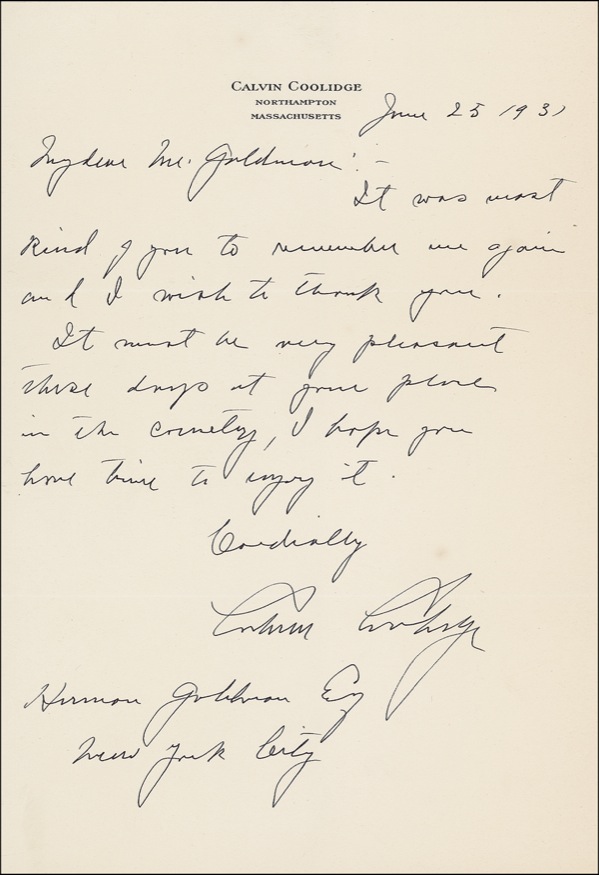 ALS, one page, 7 x 10.25, personal letterhead, June 25, 1931. Coolidge writes to Herman Goldman in New York City. In full: “It was most kind of you to remember me again and I wish to thank you. It must be very pleasant these days at your place in the country, I hope you have time to enjoy it….” A faint, tiny spot and mild handling wear, otherwise fine, bright condition. Auction LOA John Reznikoff/PSA/DNA and R&R COA.