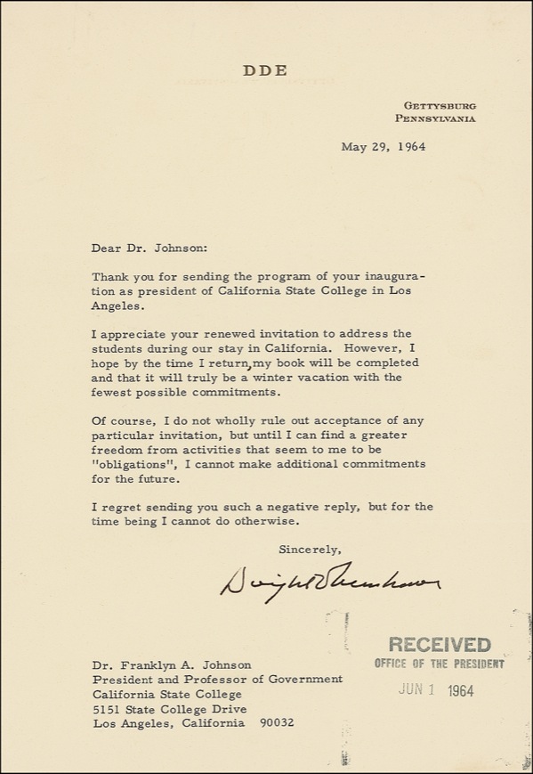 TLS, one page, 7 x 10.25, personal letterhead, May 29, 1964. Ike writes to Franklyn A. Johnson, President of California State College. In part: “Thank you for sending the program of your inauguration as president of California State College in Los Angeles. I appreciate your renewed invitation to address the students during our stay in California. However, I hope by the time I return, my book will be completed and that it will truly be a winter vacation with the fewest possible commitments. Of course, I do not wholly rule out acceptance of any particular invitation….” Accompanied by the original mailing envelope. Secretarial ink stamp, paperclip impressions, and light handling wear, otherwise fine condition. Auction LOA John Reznikoff/PSA/DNA and R&R COA.