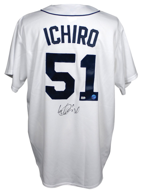 Official Majestic replica Seattle Mariners home baseball jersey, with sewn on letters and numbers, signed in felt tip on the back. In very fine condition. Auction LOA Steve Grad/PSA/DNA and R&R COA.