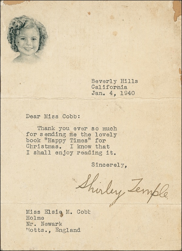 TLS, one 5 x 6.75 page affixed to a slightly larger card, pictorial personal letterhead, January 4, 1940. Temple writes to Elsie Cobb in Motts, England. In full: “Thank you ever so much for sending me the lovely book ‘Happy Times’ for Christmas. I know that I shall enjoy reading it.” In good condition, with mounting as noted, marginal chips, soiling, staining, and wrinkling, and mailing fold just touching one letter of first name. The signature is otherwise dark and clear. R&R COA.
