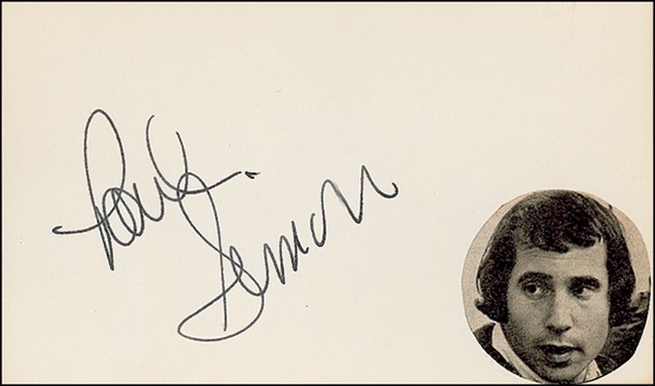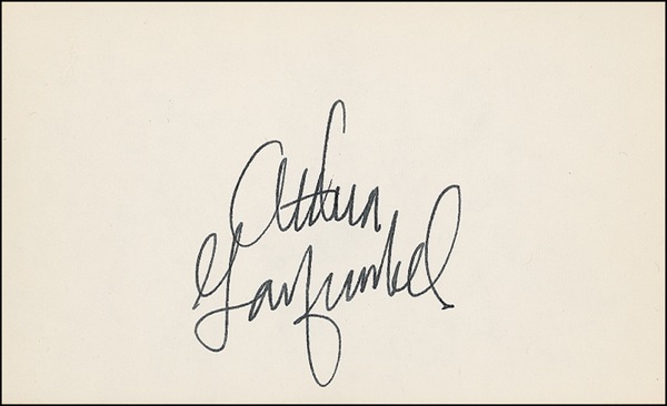 In-person felt tip signatures, “Paul Simon” and “Arthur Garfunkel,” on individual off-white 5 x 3 cards. In very fine condition, with a small clipped photo of Simon affixed to his card. R&R COA.