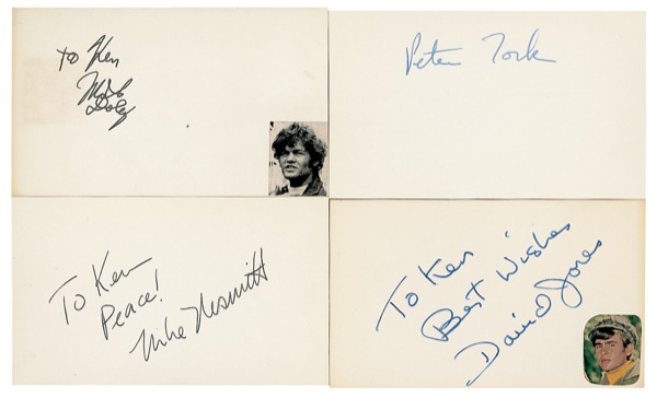 In-person ink signatures of Mickey Dolenz, Mike Nesmith, Peter Tork, and David Jones on individual off-white 5 x 3 cards, with all but Tork adding brief inscriptions. In fine condition, with block of light toning to Dolenz’s signature. COA Roger Epperson/REAL and R&R COA.