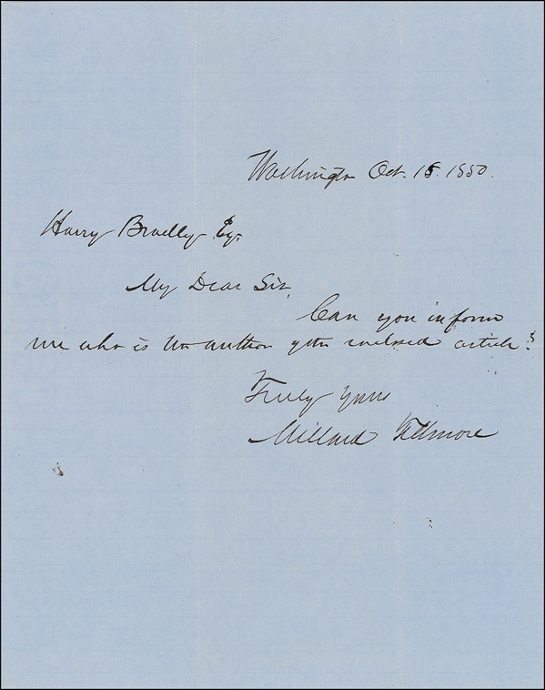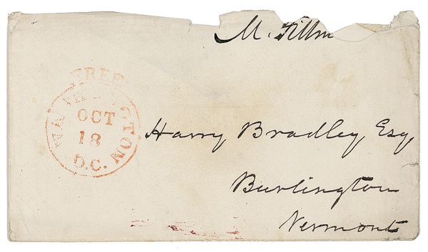 Brief letter to Harry Bradley. In full, “Can you inform me who is the author of the enclosed article?” Accompanied by the original partial free-franked mailing envelope, addressed in Fillmore’s hand to “Harry Bradley Esq., Burlington, Vermont.” Envelope is postmarked “Washington D. C., Oct. 18,” with a “Free” stamp above postmark, and a partial franking signature, “M. Fillm.,” with rest of signature missing due to paper loss along top edge. Back of envelope retains most of the original official red wax seal. In fine condition, with intersecting mailing folds, one barely touching first letter of last name and a couple trivial ink spots. Auction LOA John Reznikoff/PSA/DNA and R&R COA.