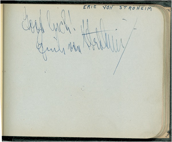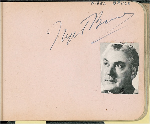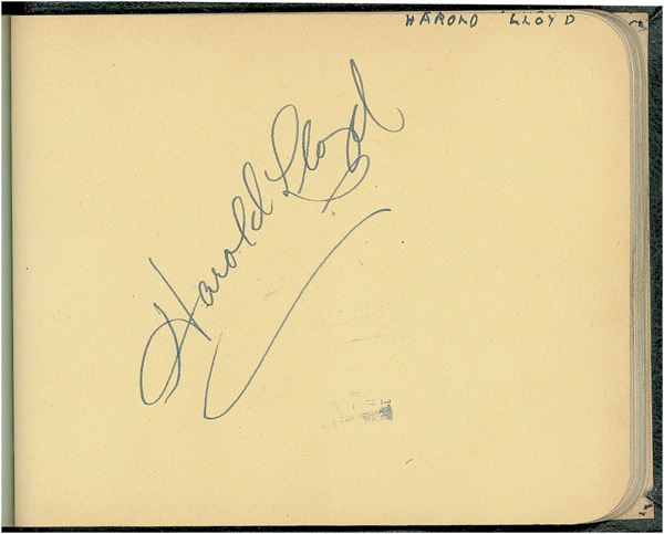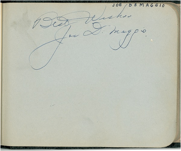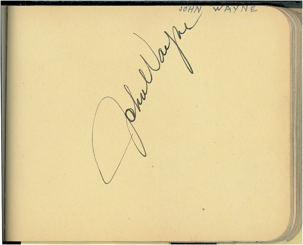 Leather-covered vintage autograph album, 6.25 x 5, signed inside in ink by 117 celebrities, all back-to-back, some with small affixed magazine photos, as well as some inscribed to Frank. Signers are: Joe DiMaggio, John Garfield, Nigel Bruce, Ronald Reagan, Erich von Stroheim, Judy Garland, Errol Flynn, John Wayne, Harold Lloyd, Henry Travers, Willie Fung, Donald Berry, Johnnie Davis, James Craig, Dennis O’Keefe and Steffi Duna, Jeanette MacDonald, Jerry Colona, Lynn Bari, John Hall and Francis Langford, Inez Cooper, Louella Parsons, Edwin MacDonald, Hedda Hopper, Renie Riano, Helene Reynolds, Rise Stevens, Marie Wilson, Clyde Fillmore, Chill Wills, Leigh Whipper, Nancy Kelly, Dorothy Lamour, Patricia Morrison, Mary Livingston, Barbara Stanwyck, Maureen O’Sullivan, Carole Landis, George Barbier, Shirley Patterson, Mona Maris, Anna Sten, the Ritz Brothers, Jean Rogers, Ann Rutherford, John Carradine, Philip Reed, Otto Preminger, Louise Allbritton, Olivia deHavilland, Alan Curtis, Bonita Granville, Patrick Knowles, Dick Powell and Joan Blondell, Steve Geray, Louise Rainer, Anne Baxter, Van Johnson, Richard Cortez, K. T. Stevens, Joseph Sawyer, Martin Kosleck, Charles Butterworth, Claire Trevor, Phyllis Brooks, Harry Langdon, Mary Brian, Sonja Henie, George Houston, Jackie Oakie, Edith Fellows, Dorothy Morris, Else Lanchester, Marsha Hunt, Helen Parrish, Justice Frank Murphy, Katherine deMille, Frances Gifford, Anthony Quinn, Pat Flaherty, Sabu, Ray Milland, Damian O’Flynn, Helen Vinson, Lew Ayres, Nan Wynn, Simone Simon, Richard Travis, George Sanders, Paul Henreid, Lynn Merrick, David Bruce, Eddie Foy, Jackie Cooper, Copina Wright, Jr., Bud McTaggart, Don Castle, Tim Holt, Maria Montez, Ginny Simms, Richard Derr, Acquanetta, Harry Davenport, Barry Nelson, Ronald Colman, Eva Gabor, Brian Donlevy, John Merton, Leo Carrillo, Bobby Jordan, Cesar Romero, Dewey Robinson, Laird Cregar, Lynne Carver, William Bendix, and Spring Byington. In very good to fine condition, with some light toning, collector’s notations to each page, and some light rippling from adhesive. R&R COA.