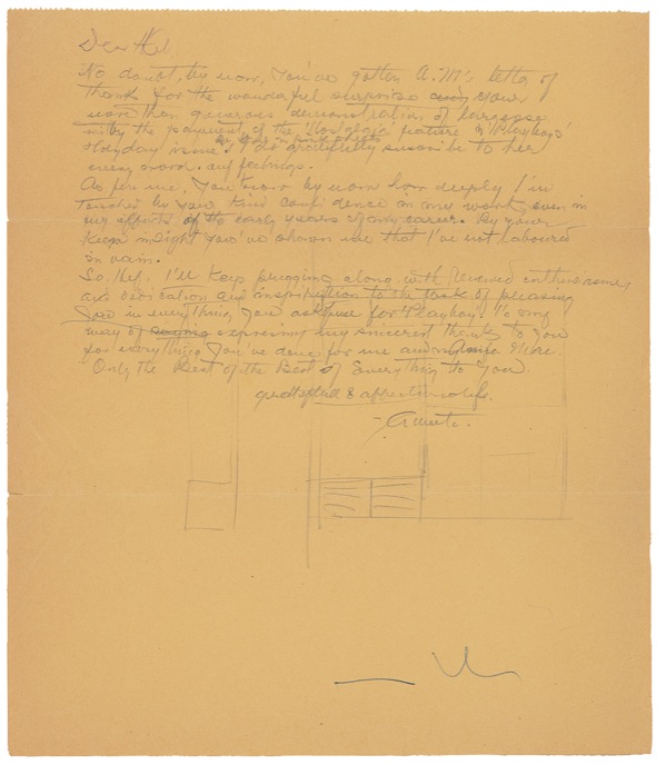 Originator of the pin-up and creator of the scantily clad Varga Girls who adorned Playboy Magazine. ALS signed “Alberto,” one page, 8 x 9.25, no date. Letter to Playboy’s Hugh Hefner. In part, “You’ve gotten A. M.’s letter of thanks for the wonderful surprises and your more than generous demonstration of largesse by the payment of the ‘Nostalgia’ feature in Playboy’s Holiday issue…So Hef, I’ll keep plugging along with renewed enthusiasm and dedication and inspiration to the task of pleasing you in everything you ask for in Playboy.” In fine condition, with light geometric pencil sketch under bottom portion of text (unknown if done by Vargas), a couple ink marks to bottom, and a few creases. R&R COA.