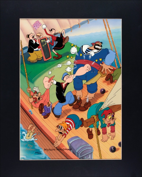 American animator, best known for his work at Fleischer Studio, where he started his career in 1930. At Fleischer he worked on Betty Boop, Raggedy Ann, Gulliver’s Travels, the animated adaptations of Superman, and Popeye. He was head animator on two Academy Award nominated shorts. Limited edition hand-painted animation cel, #245/250, entitled Mutiny, 11 x 15.25, showing Popeye handling Bluto as Wimpy and Olive Oyl watch the action, signed in black felt tip by Waldman. Matted to an overall size of 16 x 20. In very fine condition. R&R COA.