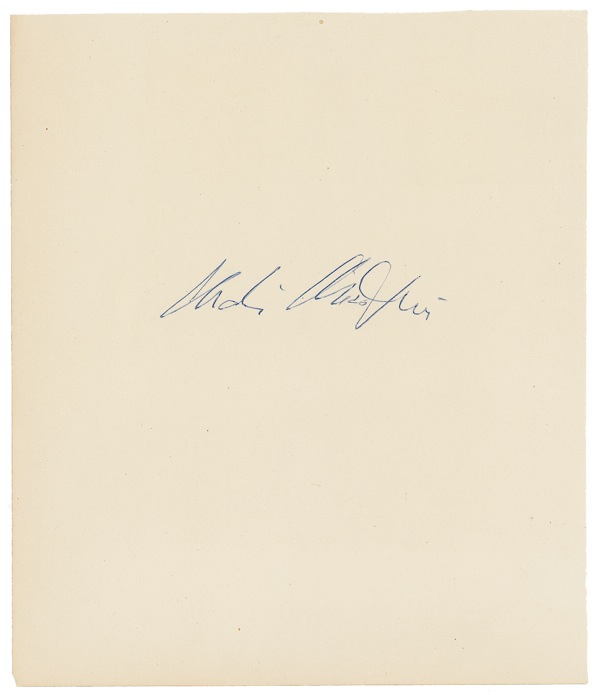 Crisp ballpoint signature, “Charlie Chaplin,” on an off-white 6.25 x 7.25 sheet. In fine condition. PSA/DNA Auction LOA and R&R COA.