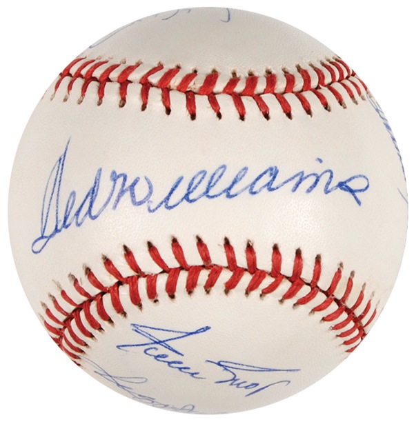 Official Rawlings American League baseball signed in ballpoint by 11 members of the prestigious 500 Home Run Club. Signers are: Ted Williams (ss), Eddie Mathews, Hank Aaron, Harmon Killebrew, Frank Robinson, Willie Mays, Mickey Mantle, Reggie Jackson, Mike Schmidt, Ernie Banks, and Willie McCovey. In fine condition. Auction LOA Steve Grad/PSA/DNA and R&R COA.