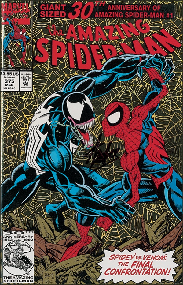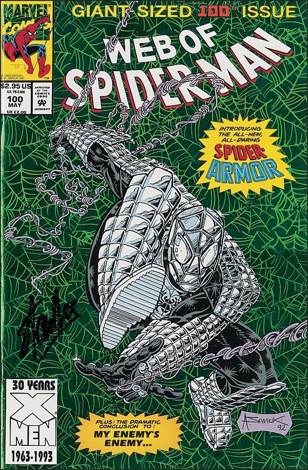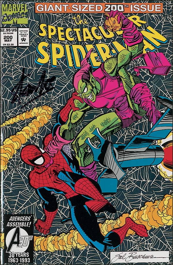 Three Spider-Man comic books, including a 30th anniversary edition of the Amazing Spider-Man, each signed on the front cover in black felt tip by Lee. In fine, fresh condition. R&R COA.