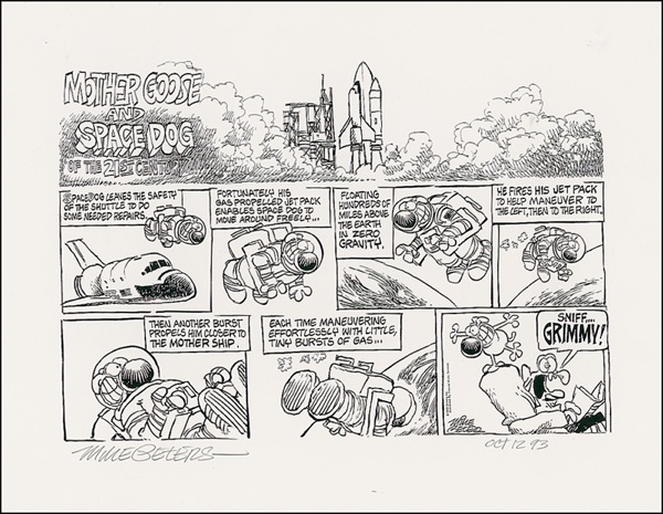 Private copy of an original Mother Goose & Grimm eight-panel comic strip from 1993, 14 x 11, signed in the lower border in pencil by Peters. Artwork was originally a donation to a charity auction and is accompanied by two letters from Grimmy, Inc. regarding the auction and care of the artwork. In fine condition. R&R COA.