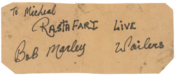 Jamaican reggae singer, songwriter, and guitarist. As a member of the Wailers, a reggae band that included Bunny Wailer and Peter Tosh, and later on his own, Marley propelled reggae to worldwide popularity. Uncommon and bold felt tip signature and inscription, “To Michael, Rasta Fari, Live, Bob Marley, Wailers.,” on an off-white 6.75 x 3 slip. In very good condition, with clipped corners, several repaired tears to reverse, scattered light soiling, and several creases, with one affecting portion of last name of signature. COA Roger Epperson/REAL and R&R COA.