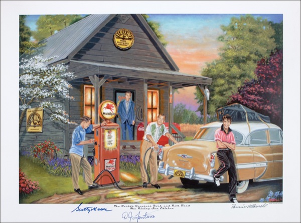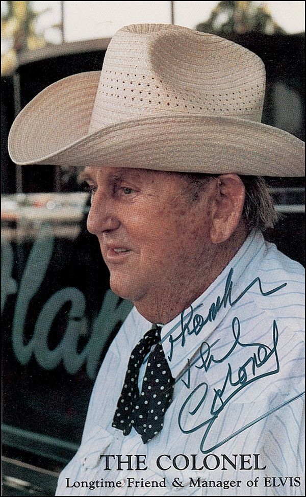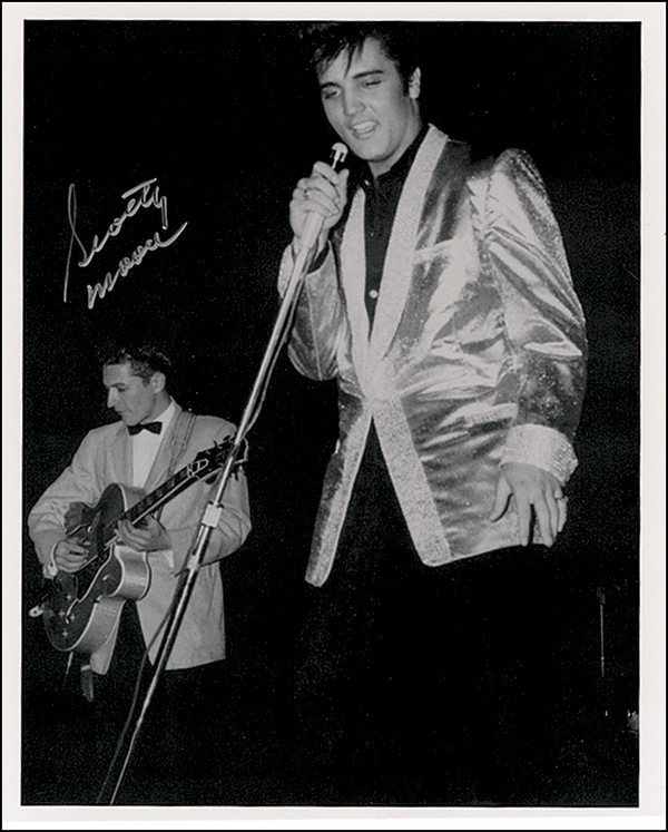 Three items: Color 24 x 18 print, signed in blue felt tip by Scotty Moore and D. J. Fontane; cardstock 8 x 10 photo, signed in silver ink by Scotty Moore; and a color 4 x 6.5 postcard photo, signed in black felt tip “Thanks, the Colonel,” and signed again on the reverse. In fine condition. R&R COA.