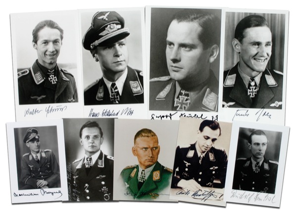Nine signed photos, ranging in size from 3.5 x 5 up to 5 x 7, including one color, each signed in ink or felt tip by the respective ace pictured. Signers are: Hajo Hermann, Erich Rudorffer, Maximilian Mayerl, Rudolf Trenkel, Helmut Ruffler, Walter Schuck, Gunther Rall, Hans Ekkehard Bob, and Gerhard Schopfel. In fine condition. R&R COA.