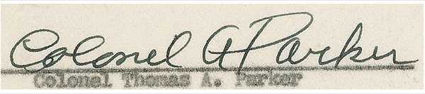DS, signed “Colonel A. Parker,” one page on onionskin, 8.5 x 13, August 31, 1956. An agreement related to the use of three songs, including “Love Me Tender,” in the film The Reno Brothers. A touch of mild handling wear, otherwise fine condition. R&R COA.