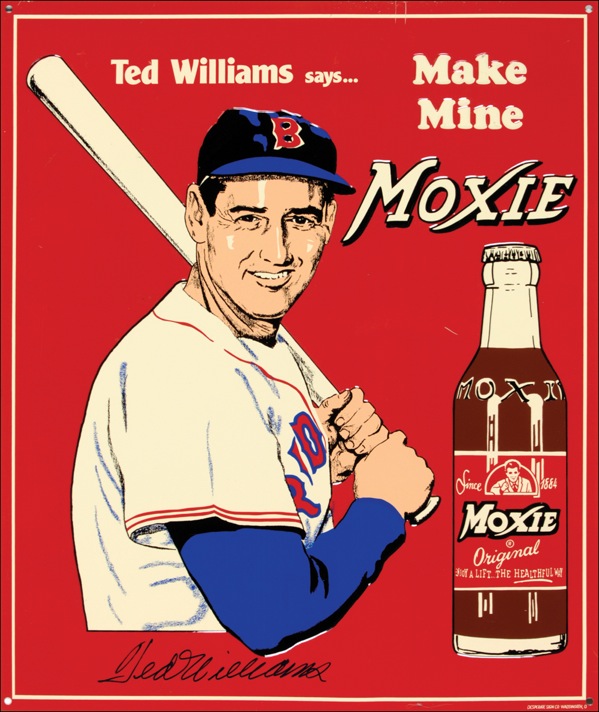 Multi-colored 11 x 13 replica tin advertising sign, “Ted Williams says…Make Mine Moxie,” signed in black felt tip below his image. In very fine condition. Auction LOA Steve Grad/PSA/DNA and R&R COA.