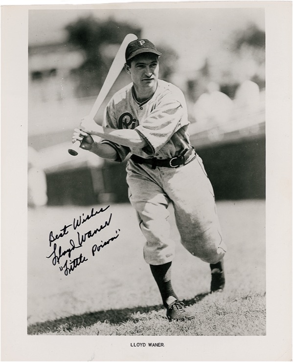 Hall of Famer who captured three National League batting titles and became a member of the exclusive 3,000 hit club. Glossy 8 x 10 photo of Waner after a swing, signed in black felt tip, “Best wishes, Lloyd Waner, ‘Little Poison.’” Some scattered light creases and surface marks, and a slightly trimmed top edge, otherwise fine condition. Auction LOA Steve Grad/PSA/DNA and R&R COA.