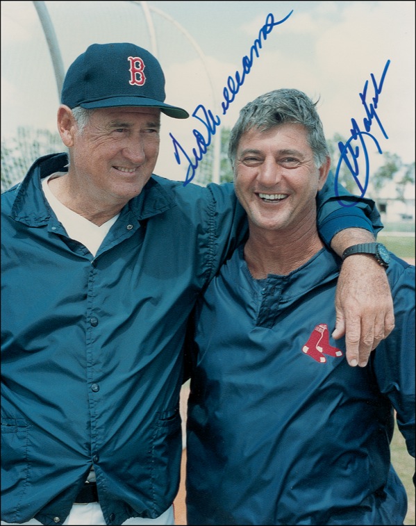 Color glossy 8 x 10 photo of the two Red Sox legends posing together at a spring training batting practice, signed in blue felt tip by both Ted Williams and Carl Yastrzemski. In very fine condition. Auction LOA Steve Grad/PSA/DNA and R&R COA.