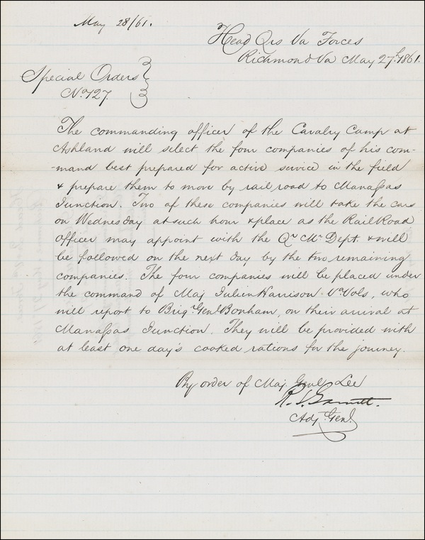 Military officer (1819–1861) who served in the U.S. Army before becoming a Confederate major general at the outbreak of the Civil War. Leading a retreat following the Battle of Rich Mountain, Garnett was shot and killed on July 13, 1861, becoming the first general to die in the conflict. Scarce war-dated manuscript DS, signed “R. S. Garnett,” one lightly lined page, 7.75 x 10, May 28, 1861. Garnett signs Special Order No. 127, which reads, in full: “The commanding officer of the Cavalry Camp at Ashland will select the four companies of his command best prepared for active service in the field & prepare them to move by railroad to Manassas Junction. Two of these companies will take the car on Wednesday at such hour & place as the Railroad Officer may appoint with the Q.M. Dept. & will be followed on the next day by the two remaining companies. The four companies will be placed under the command of Maj. Julien Harrison, Va. Vols., who will report to Brig. Genl. Bonham, on their arrival at Manassas Junction. They will be provided with at least one day’s cooked rations for the journey. By order of Maj. Gen’l Lee….” The attack on Fort Sumter, marking the official beginning of the Civil War, took place a month earlier, on April 12; Garnett was killed less than two months after signing this order. Faint show-through of ink docket on reverse, otherwise very fine, fresh condition. An outstanding example of a notable Civil War rarity! Auction LOA John Reznikoff/PSA/DNA and R&R COA.