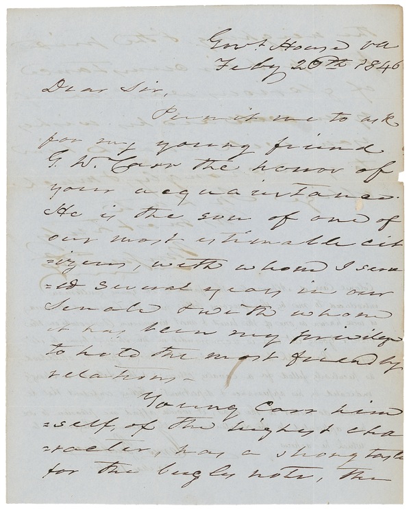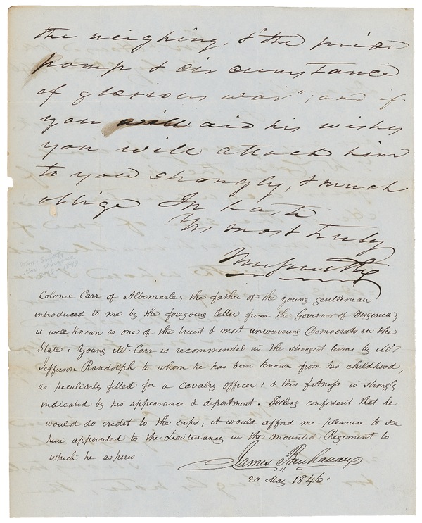 ALS at the conclusion of a letter sent by future Confederate Major General William Smith, one page both sides, 8 x 10, the original letter dated February 26, 1846, Buchanan’s reply dated May 20, 1846. Smith writes, in part: “Permit me to ask for my young friend G. W. Carr the honor of your acquaintance. He is the son of one of our most estimable citizens, with whom I served several years in our Senate & with whom it has been my privilege to have the most friendly relations. Young Carr himself, of the highest character, has a strong taste for the bugle’s note, the neighing, & the ‘pride, pomp, & circumstance of glorious war’….” Buchanan, then secretary of state, responds thus: “Colonel Carr of Albemarle, the father of the young gentleman introduced to me by the foregoing letter from the Governor of Virginia, is well known as one of the truest & most unwavering Democrats in the State. Young Mr. Carr is recommended in the strongest terms by Mr. [Thomas] Jefferson Randolph [grandson of the third president] to whom he has been known from his childhood, as peculiarly fitted for a Cavalry Officer, & this fitness is strongly indicated by his appearance & deportment. Feeling confident that he would do credit to the corps, ti would afford me pleasure to see him appointed to the Lieutenancy in the mounted Regiment to which he aspires.” William Smith (1797–1887), then Governor of Virginia, was one of the oldest Confederate generals in the Civil War, in which he commanded troops while in his mid-to-late sixties. Intersecting folds (vertical fold to first name), mild wrinkling, a few small tears, chips, and blots to Smith’s text, and faint show-through of ink, otherwise fine, clean condition. Buchanan is uncommon in this format. Auction LOA John Reznikoff/PSA/DNA and R&R COA.