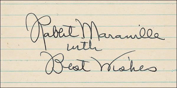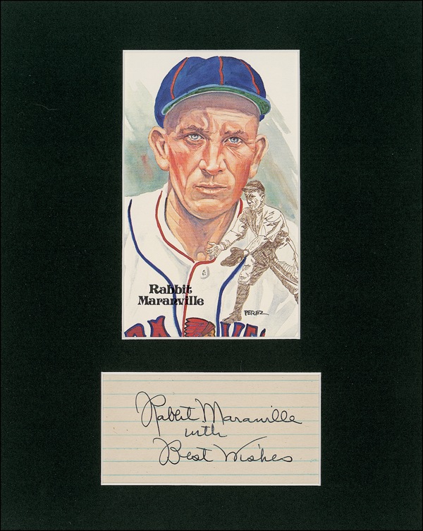 During his 23-year career as an infielder (1912-35), mostly with the Boston Braves, he established many fielding records with his colorful play, including most lifetime putouts by a shortstop (5,133). He was elected to baseball’s Hall of Fame in 1954. Vintage ink signature, “Rabbit Maranville with Best Wishes,” on an off-white lined card. Matted with a Perez-Steele card to an overall size of 8 x 10. In fine condition. Auction LOA Steve Grad/PSA/DNA and R&R COA.