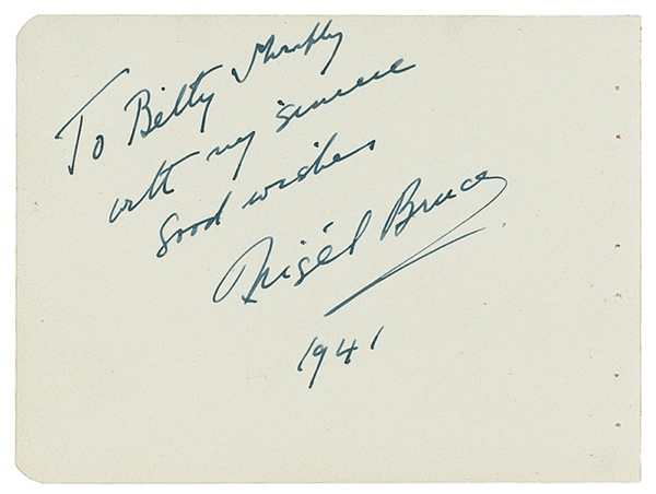 Played Dr. Watson opposite Basil Rathbone’s Sherlock Holmes. Vintage fountain pen signature and inscription, “To Betty Murphy, With my sincere good wishes, Nigel Bruce,” on a light green 6 x 4.5 album page, dated 1941. In fine condition, with small holes to right edge from removal from album. PSA/DNA Auction LOA and R&R COA.