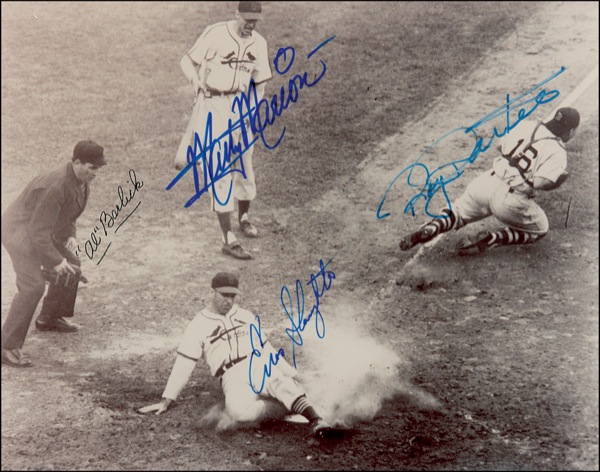 Glossy 9.25 x 7.25 photo of the famous “Mad Dash” during the 1946 World Series, signed in blue and black ink by all four pictured: Al Barlick, Marty Marion, Enos Slaughter, and Roy Partee. Possible slight trimming to edges, otherwise very fine condition. Auction LOA Steve Grad/PSA/DNA and R&R COA.